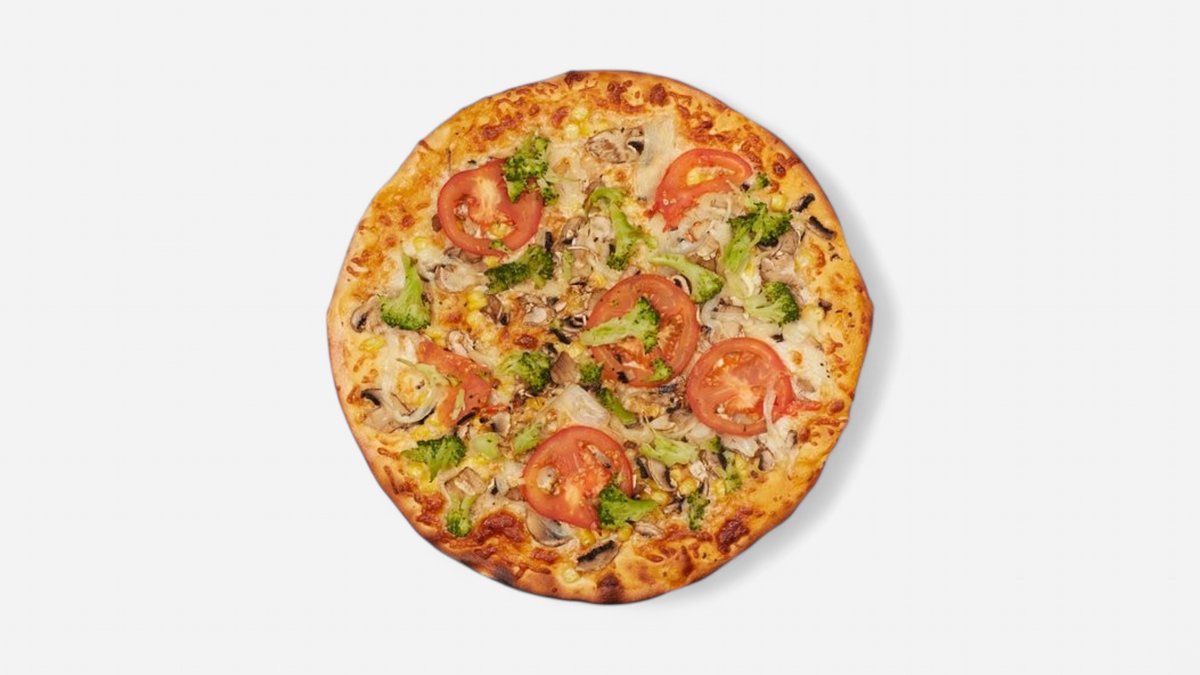 cesto, paradajkový základ, mozzarella, paradajka, brokolica, kukurica, šampiňóny, olivy, syr s modrou plesňou 755 g / obsahuje: 1, 4, 7
