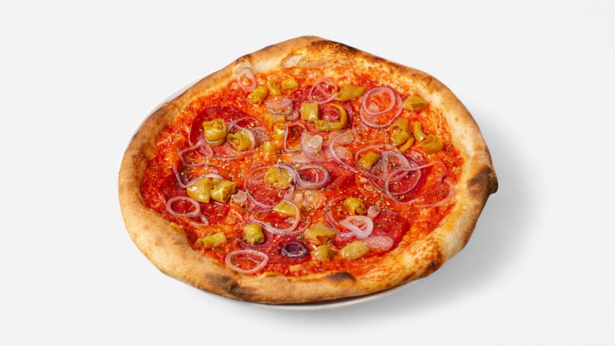 cesto, paradajkový základ, mozzarella, šunka, saláma, cibuľa, šampiňóny, chilli, feferóny 785 g / obsahuje: 1, 7