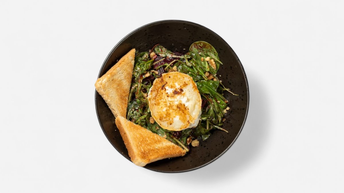 cvikla, kozí syr, rukola, špenát, vlašské orechy, medový a balzamico dresing, toast 255 g / obsahuje: 1, 3, 7, 8