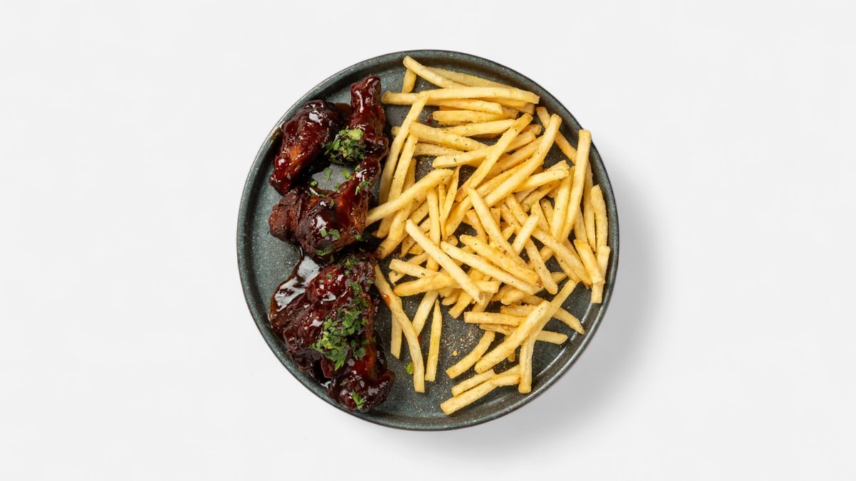 kuracie krídla v buffalo marináde (bbq+chilli), hranolky 500 g / obsahuje: 1, 3, 7, 10