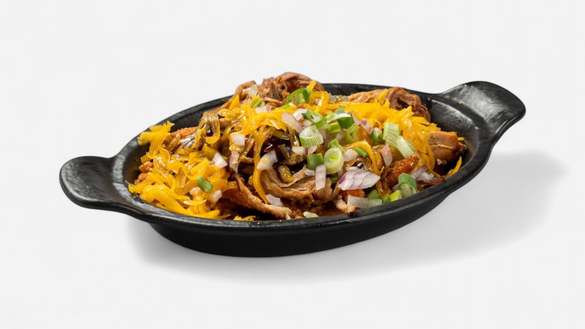 pomaly pečené trhané bravčové mäso, batatové hranolky, cheddar, BBQ omáčka, cibuľa 350 g / obsahuje: 1, 7, 10