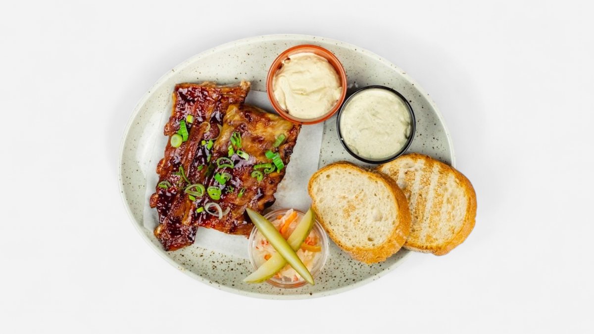 bravčové rebrá v BBQ marináde, nakladaná zelenina, coleslaw šalát, zapečený chlieb s bylinkovým maslom, dip podľa výberu 1000 g / obsahuje: 1, 3, 7