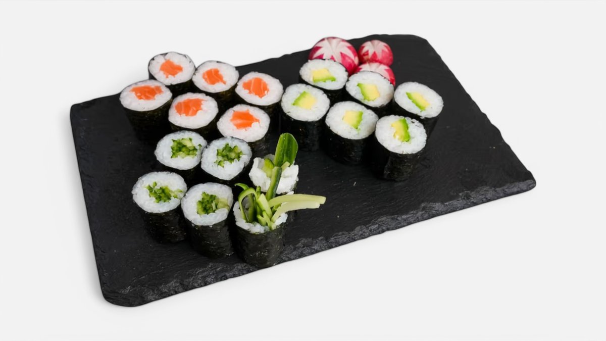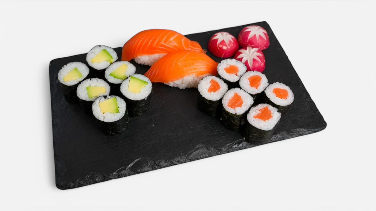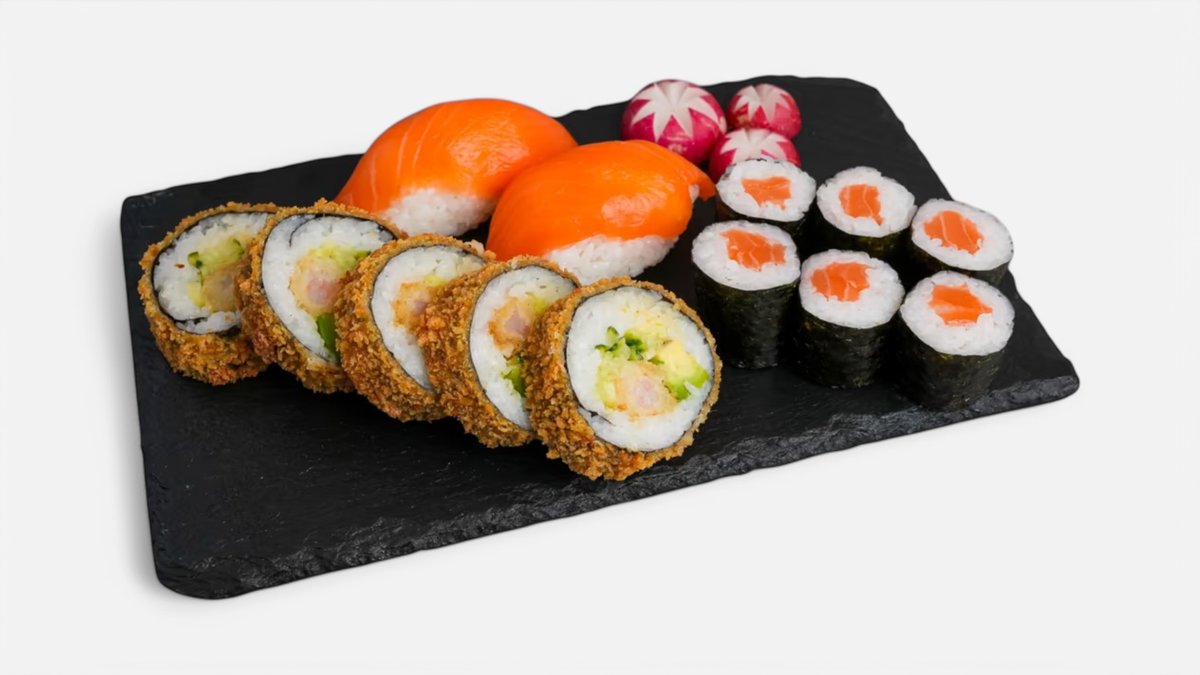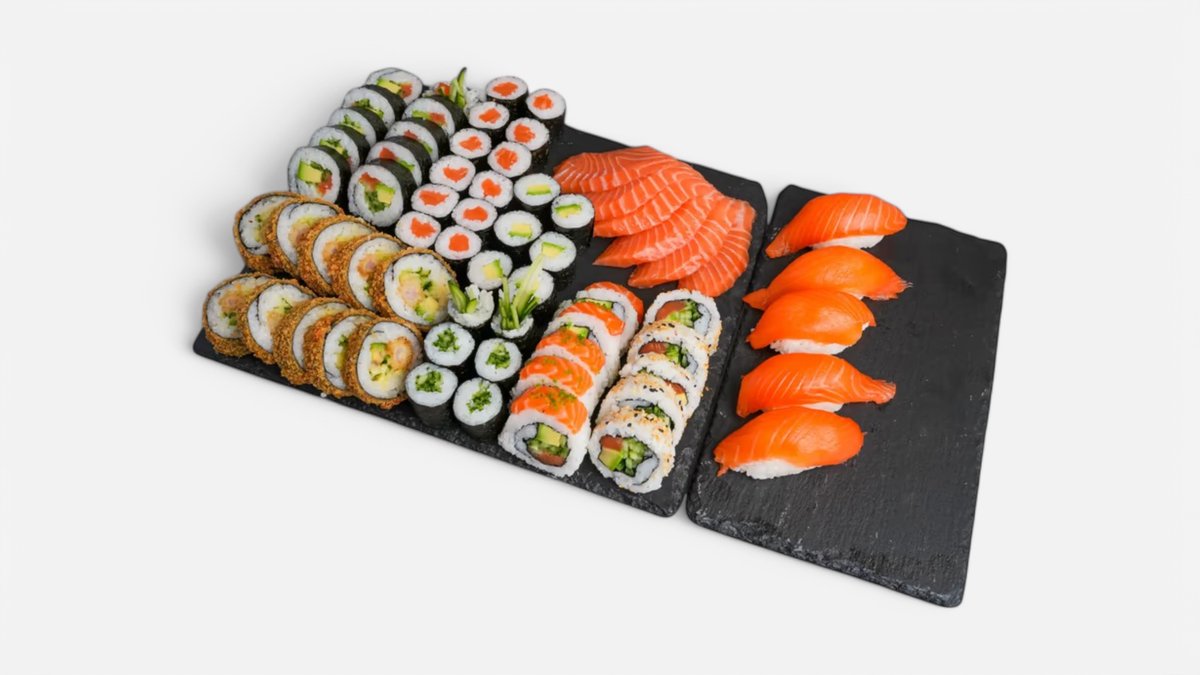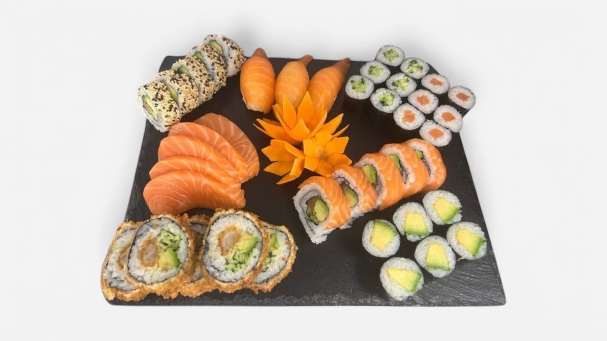 Ebi tempura (10ks) Californie futomaki (10ks) Tobiko uromaki (5ks) Sake uramaki (5ks) Sake maki (12ks) Avokádo maki (12ks) Sashimi sake (6ks) Sake nigiri (5ks) Môžete si vybrať podľa seba.