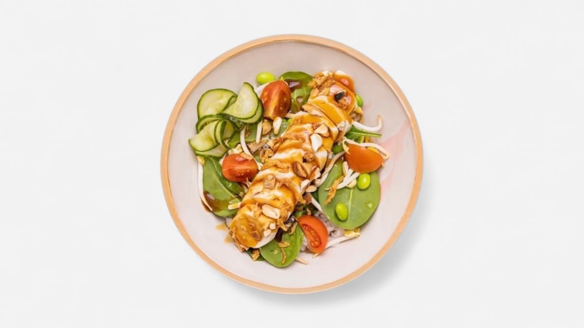 Sushi ryža , sojova omáčka , sladké chilli omáčke , teryaky omáčka , edamame , rajčina , kurací prsia , mrkva , fritované cibuľa , sezam