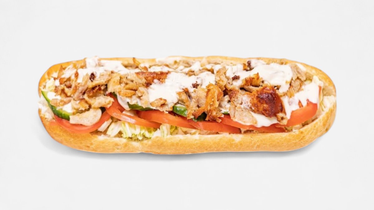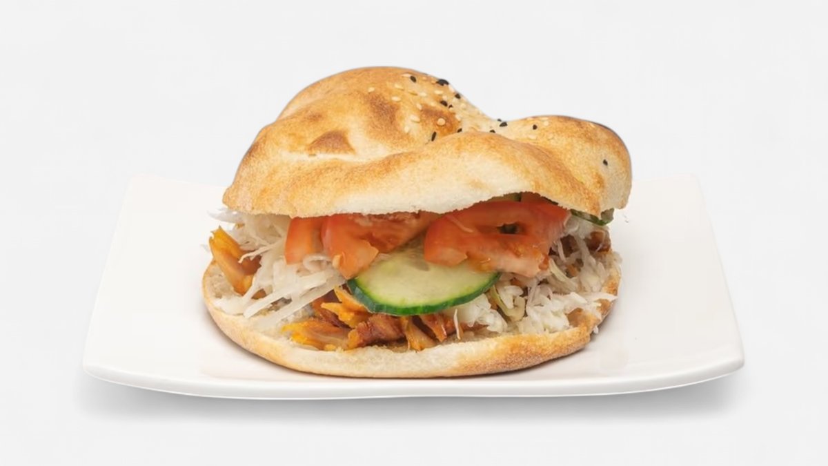 žemľa, kebab mäso, ľadový šalát, cibuľa, uhorka, paradajka, dressing cesnakový 300g / Obsahuje: 1,3,7,10
