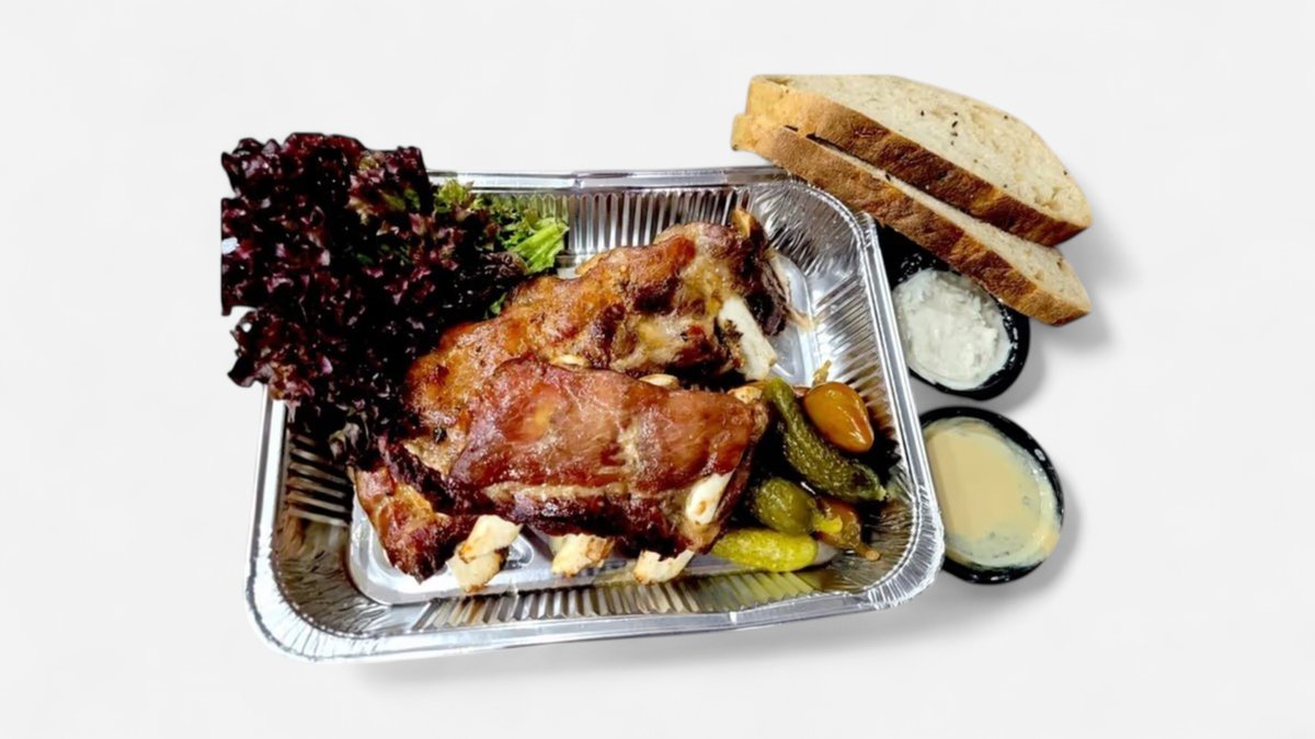 grilované rebrá, 2x chleba, horčica, chren, feferónky, kyslá uhorka 650g / Obsahuje: 1,10