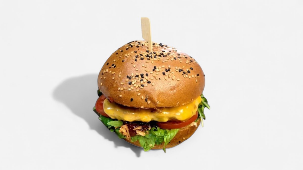 žemľa domáca, 150g hovädzie mäso, opekaná slanina, syr cheddar, políníček, rukola, šalát, paradajka, smažená cibuľka, slaninový dressing, majonéza + 100g hranolky 480g / Obsahuje: 1,3,7,10,11