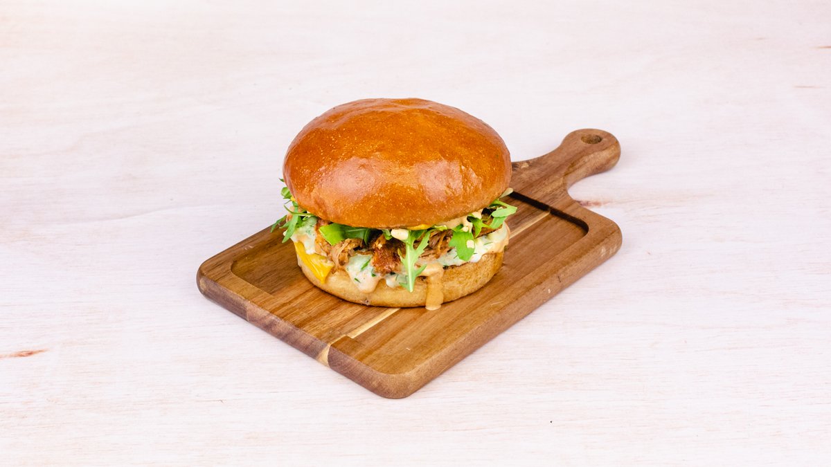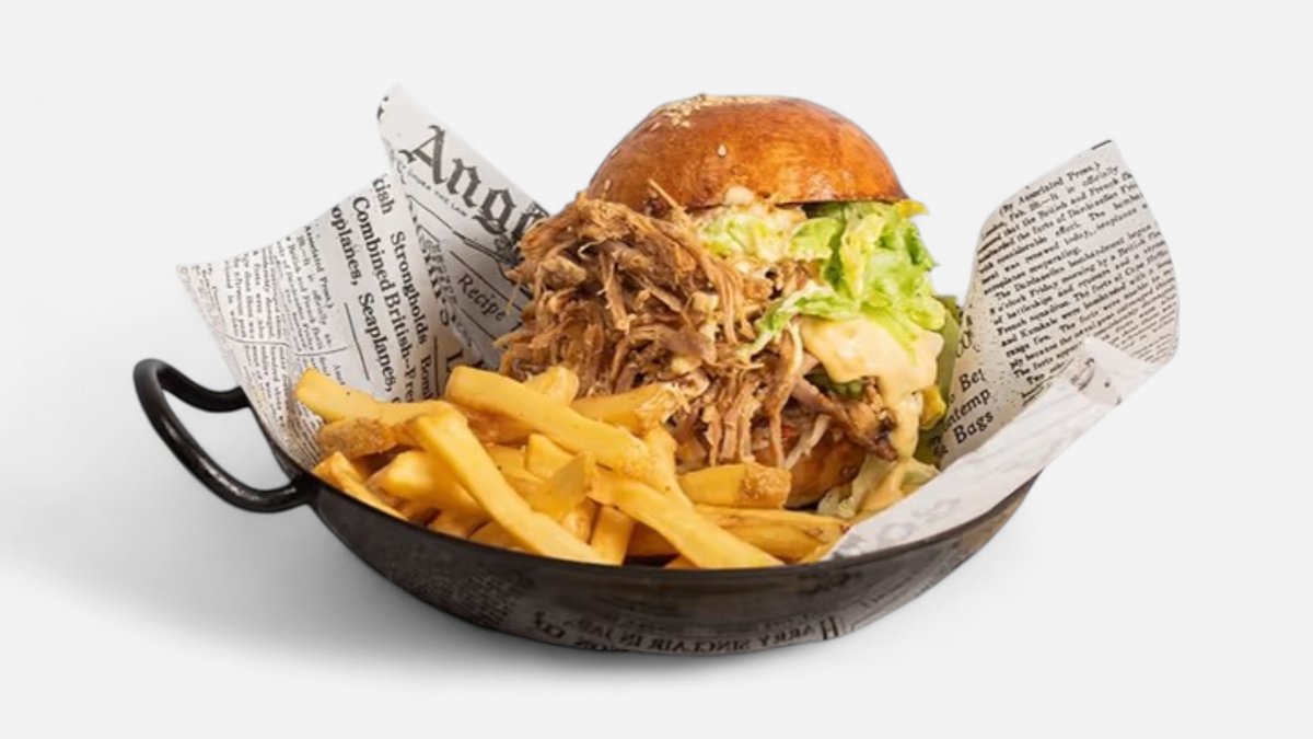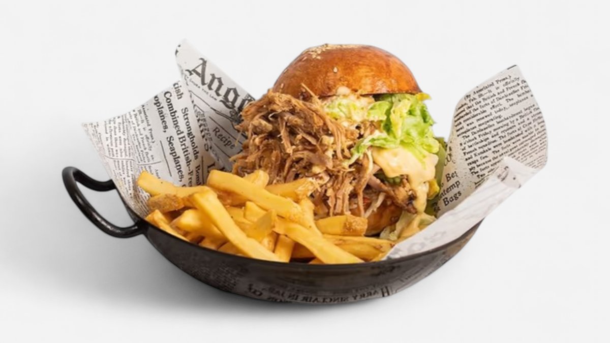 žemľa domáca, 125g bravčové trhané mäso, opekaná slanina, syr cheddar, políníček, rukola, šalát, paradajka, smažená cibuľka, slaninový dressing, majonéza + 100g hranolky 470g / Obsahuje: 1,3,7,11