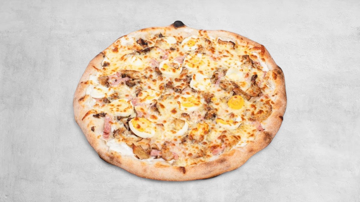 tomat, oregano, šunka, slanina, vajce, syr 700 g / obsahuje: 1,3,7