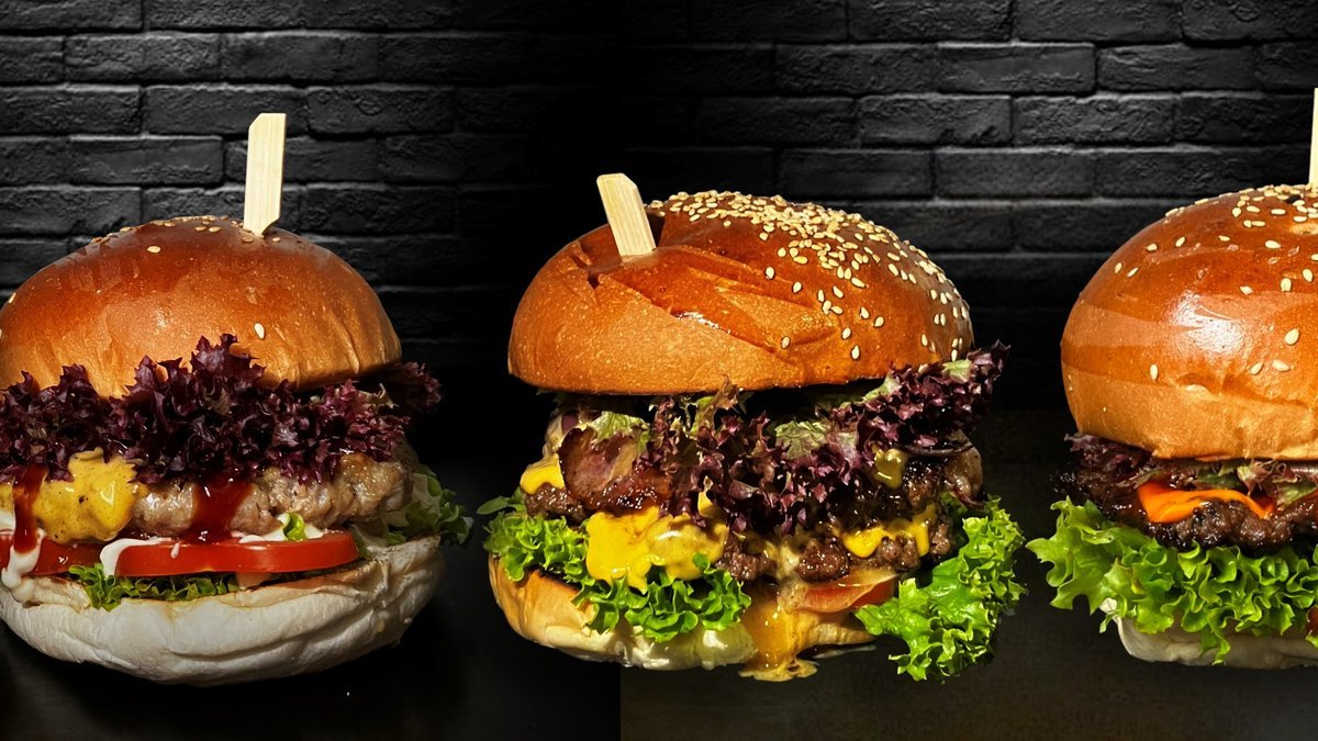 Foto je ilustračná + Domáca žemľa,150g BIO hovädzie mäsko, dvojita slaninka , karamelizovaná cibuľka, 3ks cibuľové kružky, cheddar syr, alioli majonéza