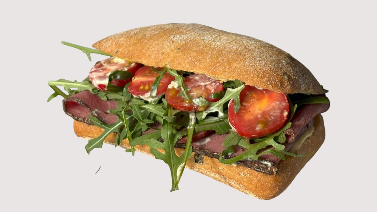 Ciabatta plnená hovädzím pastrami, medovo-horčicový dresing