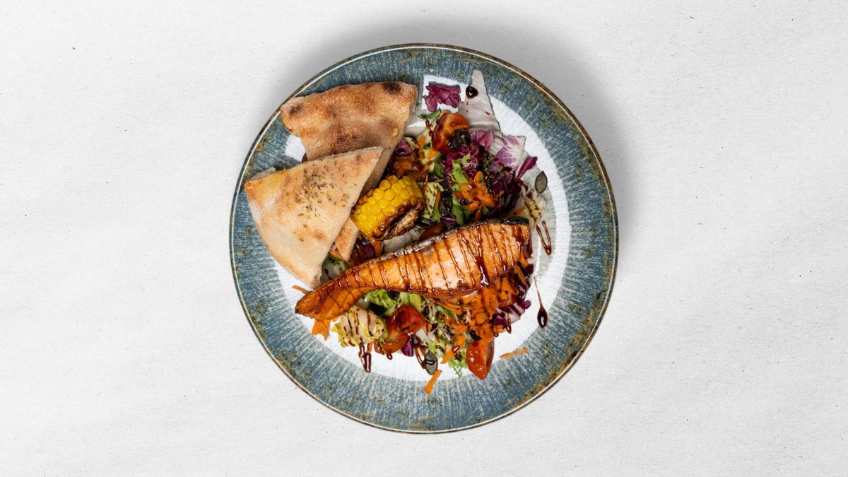 Miešaný listový šalát, cherry paradajky, rukola, grilovaný losos, tekvicové jadierka, kukuričný klas, olivový olej, balsamico. 350 g