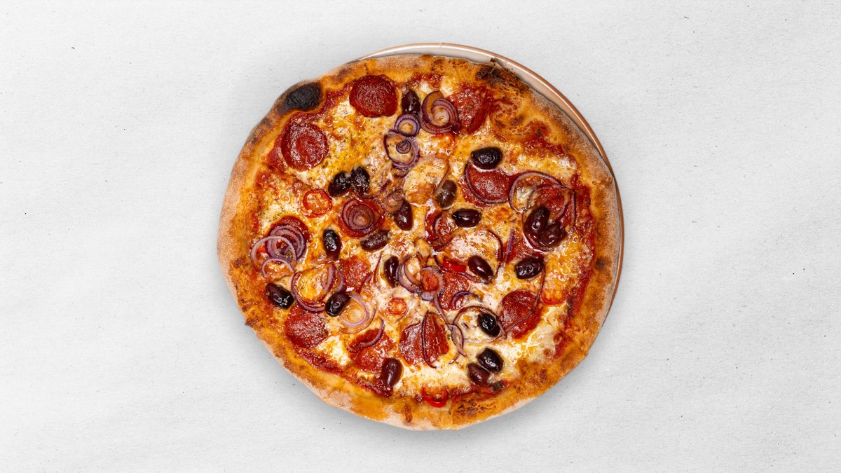 Paradajková omáčka, mozzarella, pikantná saláma, olivy, červená cibuľa, chilli papričky, oregano. 540g
