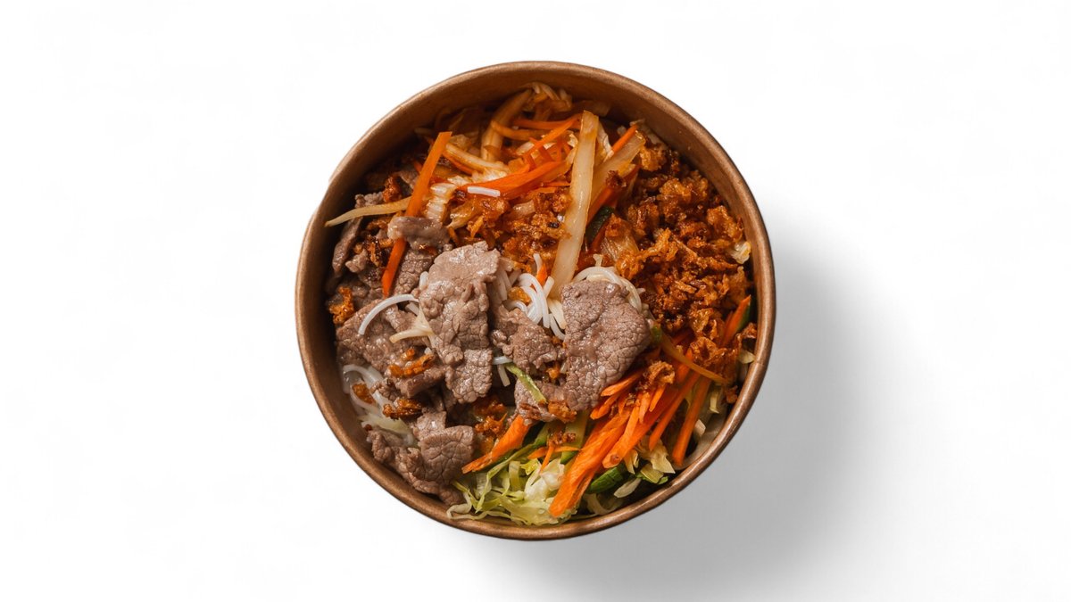 hovädzie mäso, hlávkový šalát, mrkva, uhorka, ryžové rezance, sušená cibuľka