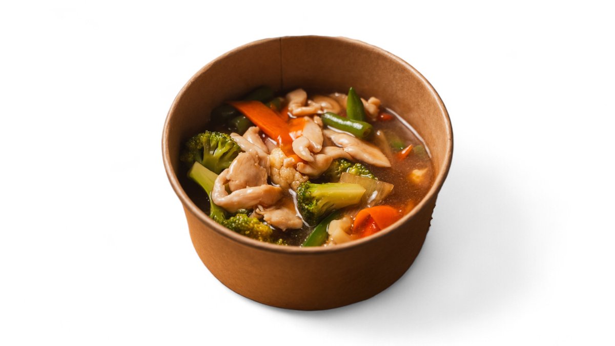 na výber: kuracie mäso, hovädzie mäso, krevety, tofu + tenké ryžové rezance, kuracie mäso, sezonna zelenina, sušená cibuľka