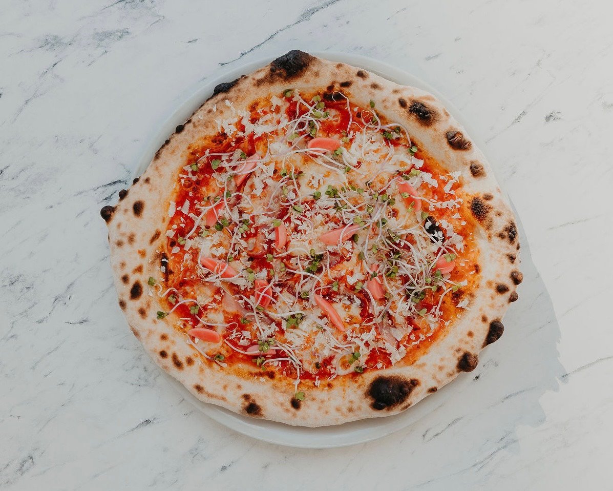 paradajkový základ San Marzano, mozzarella fior di latte, slanina, nakladané reďkovky, klíčky, čerstvý chren 400g / obsahuje alergény: 1,7