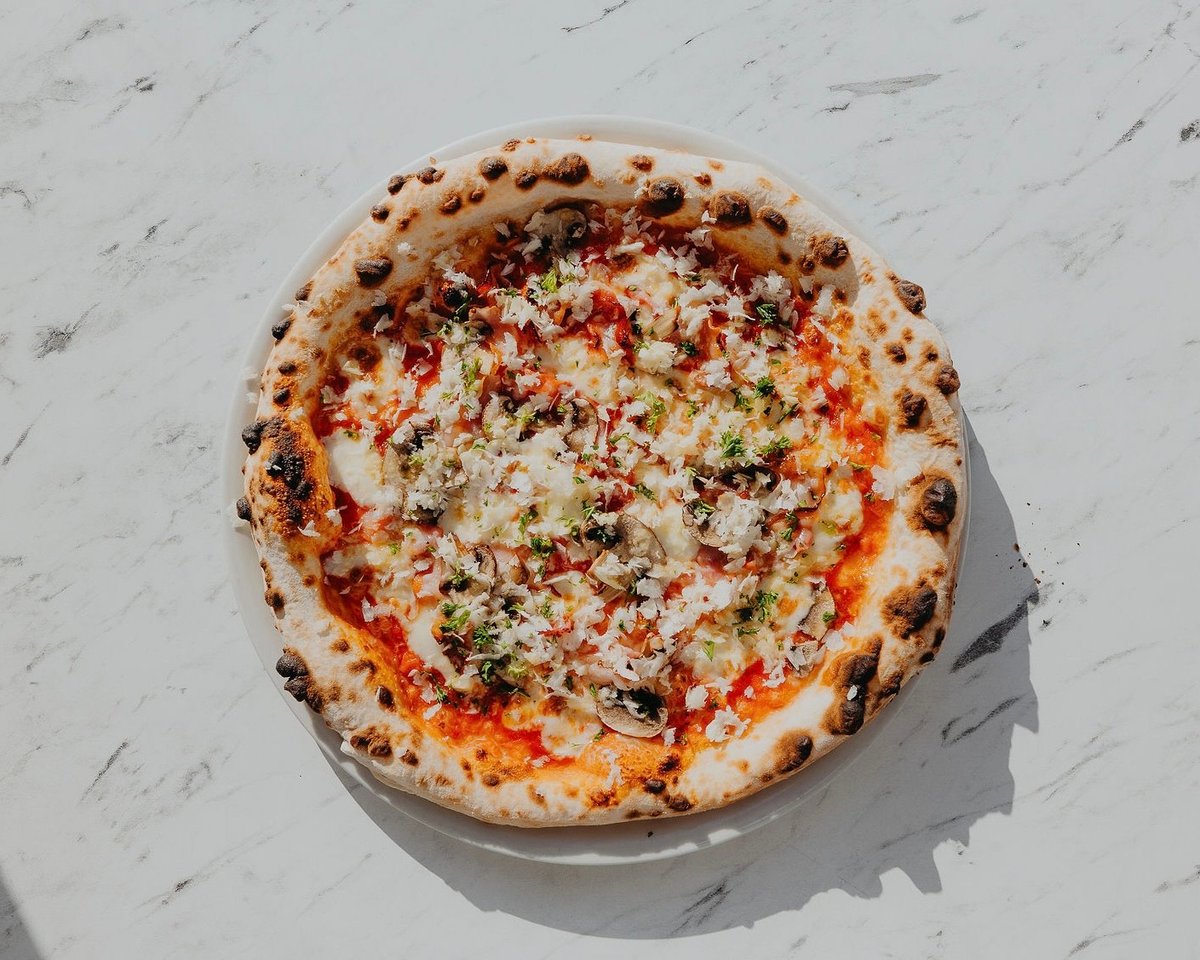 paradajkový základ San Marzano, mozzarella fior di latte, slanina, šampiňóny, čerstvý petržlen, petržlenová vňať, cesnakový olej 400g / obsahuje alergény: 1,7