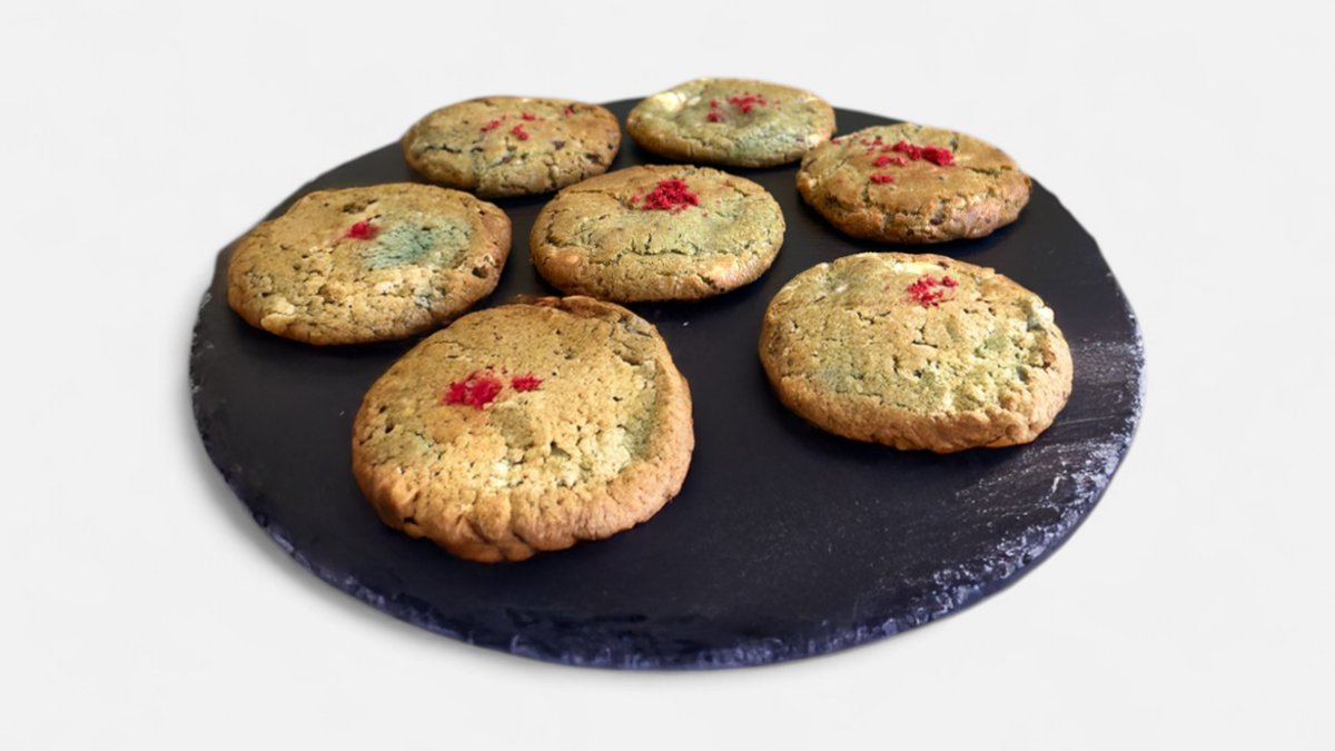 Cookies matcha malina Zloženie: múka, cukor, biela čokoláda, maliny, maslo, vajcia, matcha, soľ, kypridla (1ks)