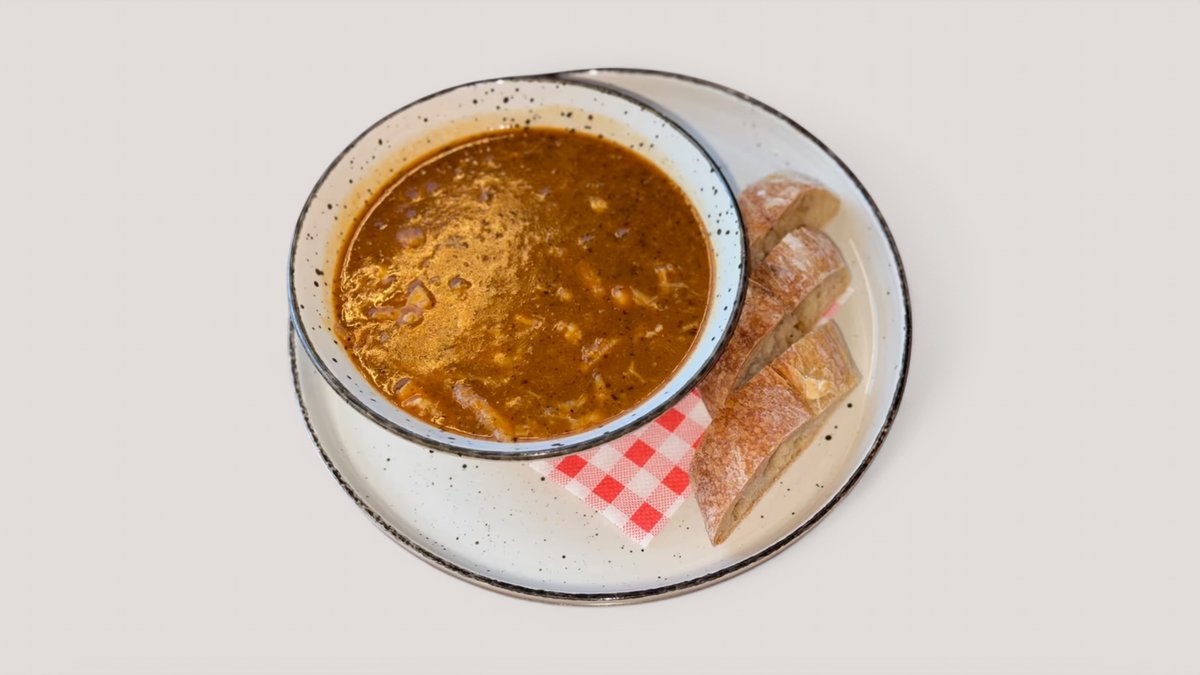 Jemne pikantný hovädzí pivársky guláš z krku s nakladanou cibuľkou s chrenom, vňaťkou, jalapeño papričkami a karlovarskou alebo parenou knedľou Obsahuje: 1,3,7, 400/150 g