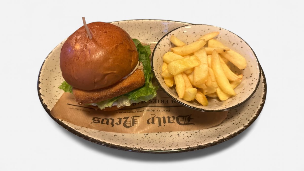 Láska v buchte remeselná žemľa, vyprážaná Gouda 48%, zelený šalát, domáca tatarská omáčka, paradajka a zemiakové hranolčeky 350/150 g Alergény: 1,3,7