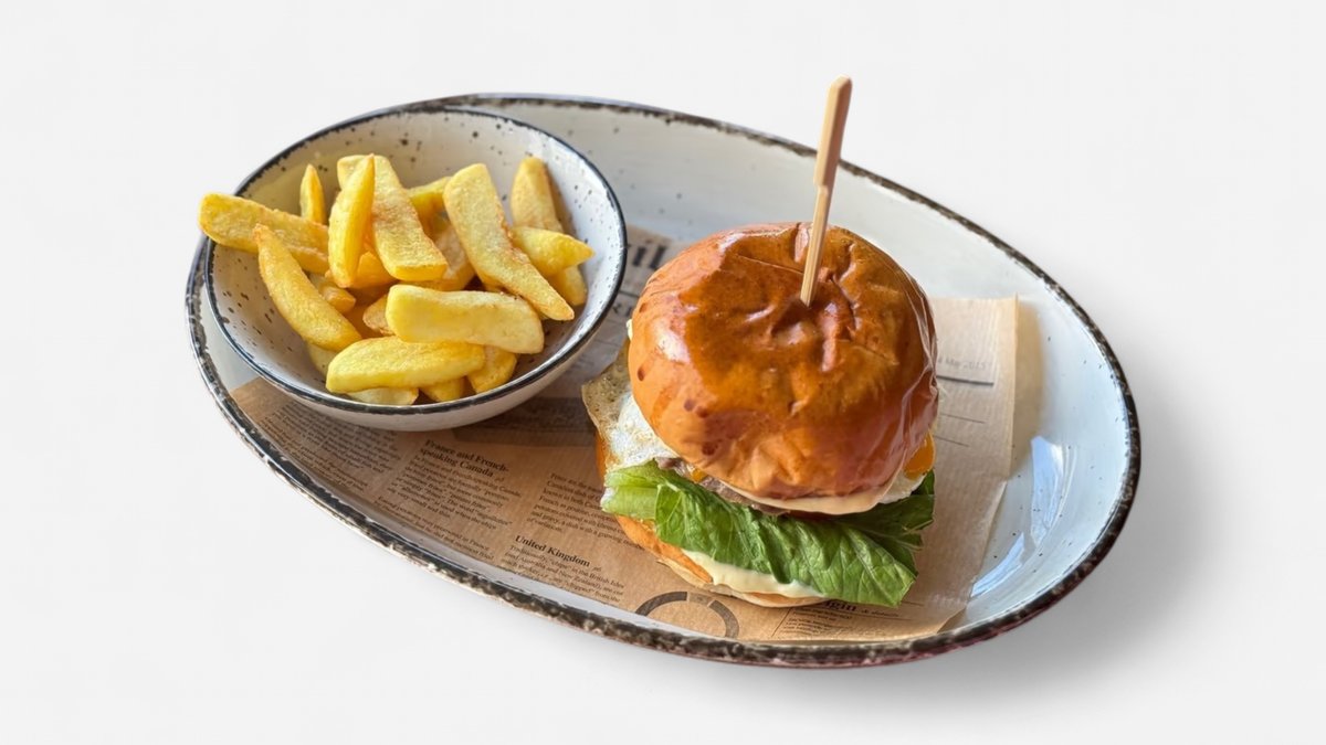 Kurací burger v remeselnej žemli marinované vyprážané kuracie prsia, mozzarella, pažitková majonéza, nakladaná červená cibuľka, chrumkavý šalát, zemiakové hranolčeky 150 g