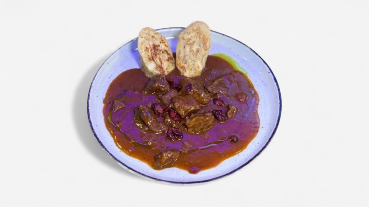 Jelenie ragú na červenom víne s bylinkami a brusnicami, karlovarská alebo parená knedľa 400g/150g obsahuje: 1,3,7,9