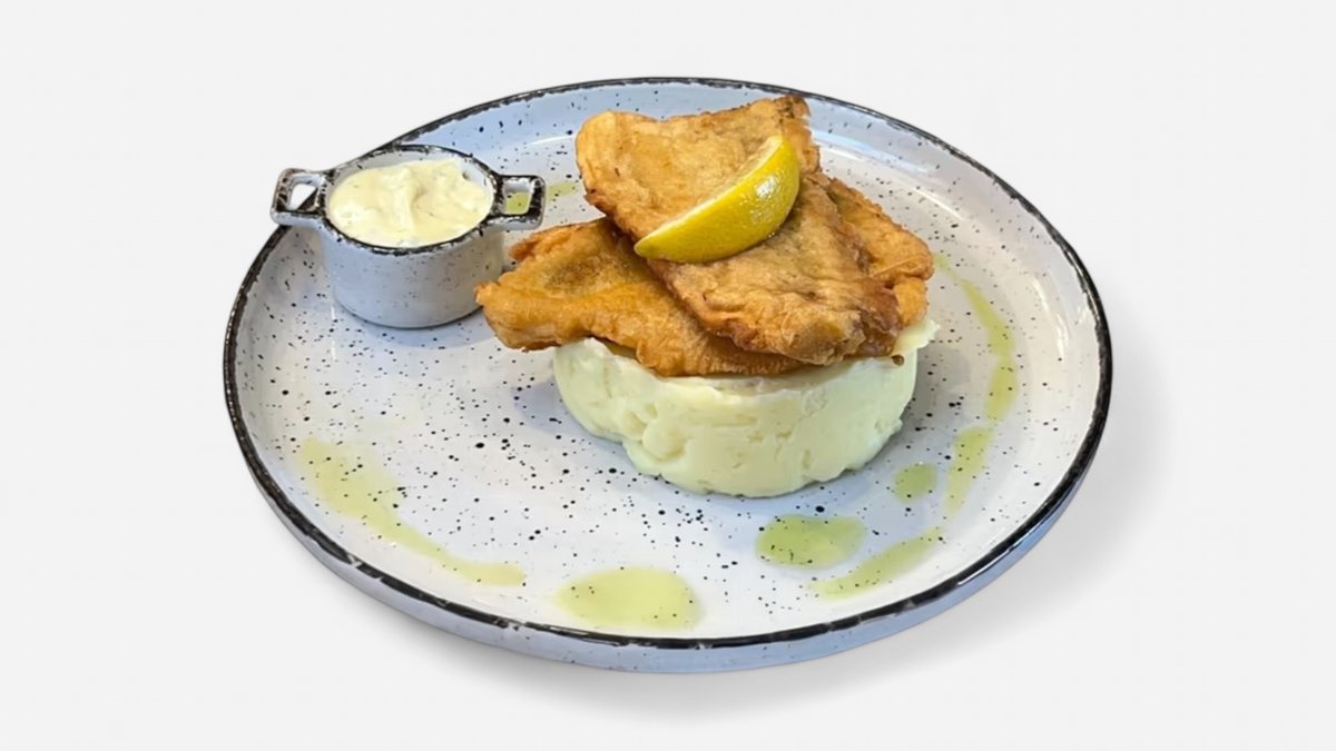 Zubáč v pivárskom cestíčku s pažitkovou majonézou, grilovaným citrónom a zemiakovou kašou s maslom 350/180 g Alergény: 1,3,4,7