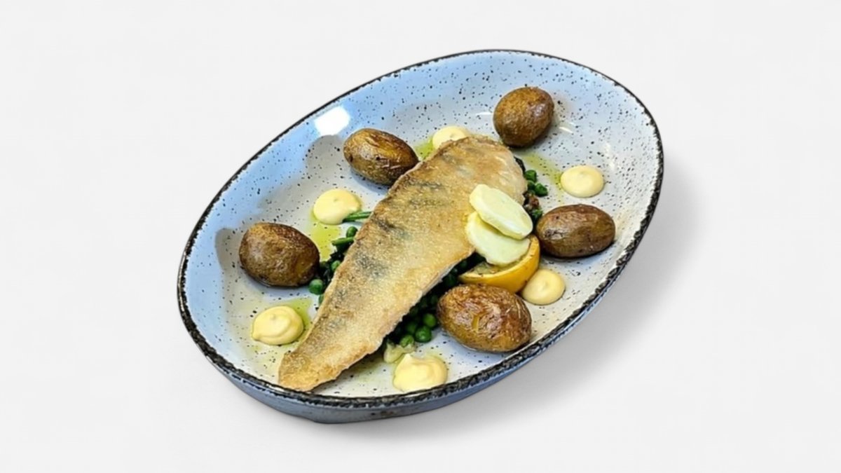 Grilovaný zubáč s limetkovým maslom zemiakmi grenaille, mätovým hráškom, špenátom a zaúdenou majonézou s karamelom 350/180 g Alergény: 1,3,4,7