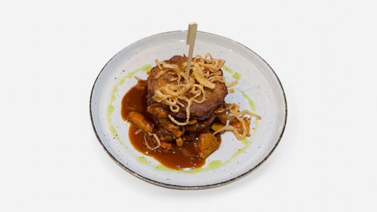 Zemiakové placky prekladané bravčovými rezančekmi z panenky so zeleninou a šampiňónmi v pikantnej omáčke podávané s viedenskou cibuľkou. 350g/150 g obsahuje: 1,3,7