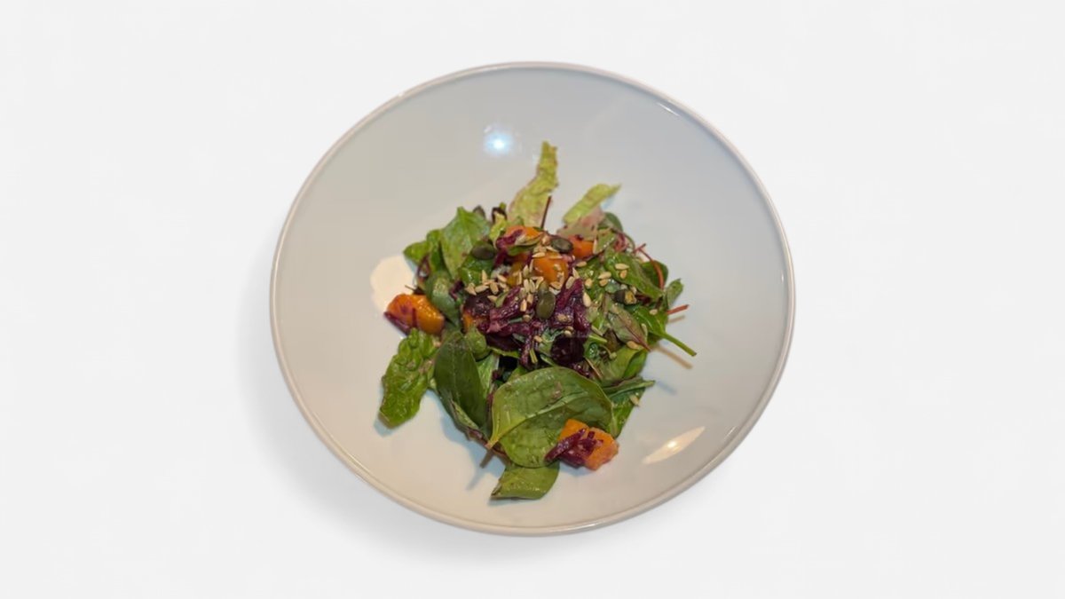 Šalát s fialovou karotkou miešanými šalátovými listami, opekanými slnečnicovými a ľanovými semiankami, pečenými lieskovcami, nakladanou červenou kapustou s feniklom a pomarančom, pečenou červenou repou v malinovom octe Obsahuje: 8 380/ 70g