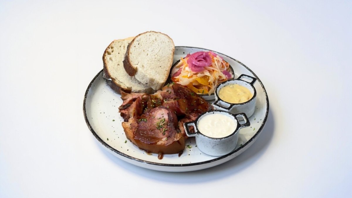 Vykostené údené bravčové koleno z grilu s redukciou z Viedenskej trinástky Dr. Flámma a medu, s pikantnou horčicou, domácou čalamádou, chrenom a pivárskym chlebom 300 g Alergény: 1,3,10
