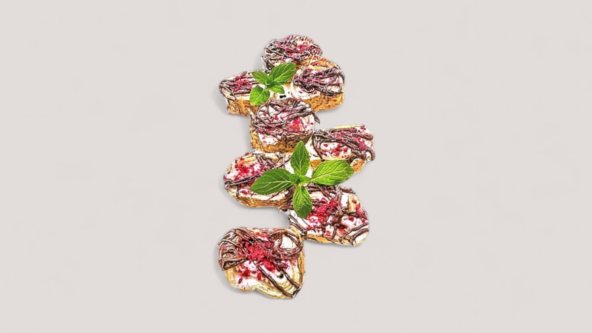 palacinková rolka s tvarohom, banánom, Nutellou a sušenou malinou / obsahuje: 1,3,7