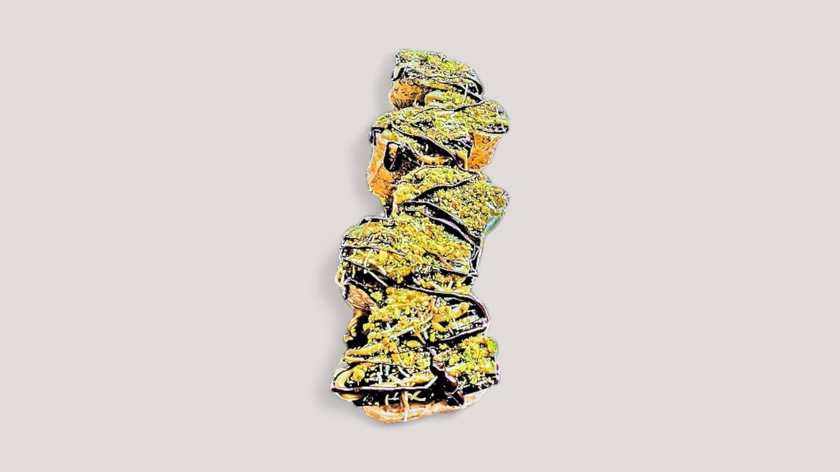 palacinka plnená tvarohom a celým banánom, zvinutá a poliata Nutellou a pistáciovou pastou, posypaná kadaifom a pistáciami / obsahuje: 1,3,7,8