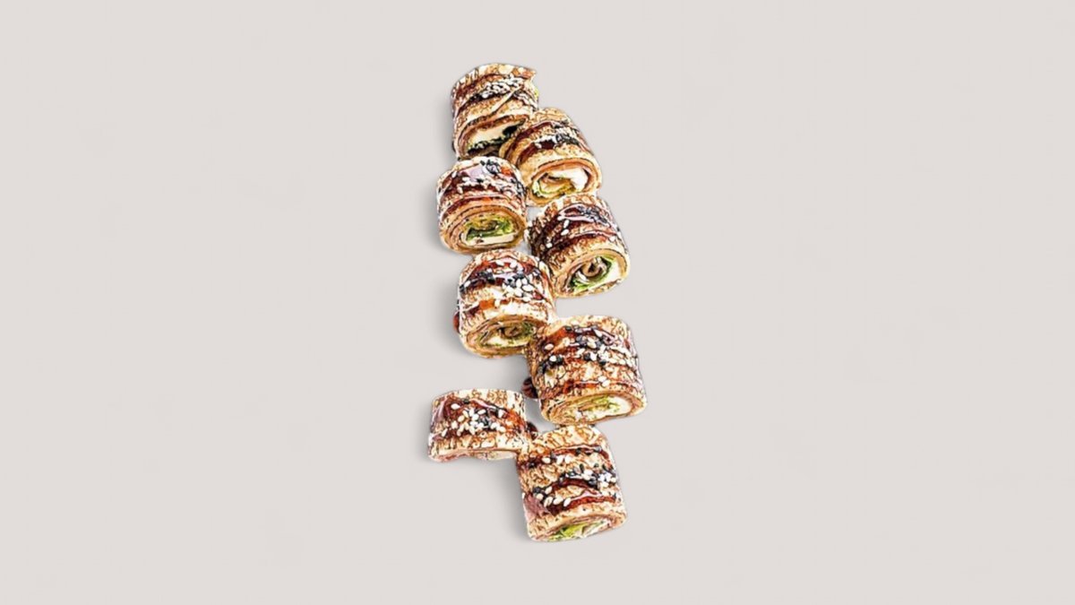 palacinka, smotanový syr, listový šalát, uhorka, prosciutto, teriyaki omáčka, sezamové semienka / obsahuje: 1,3,7,8,11