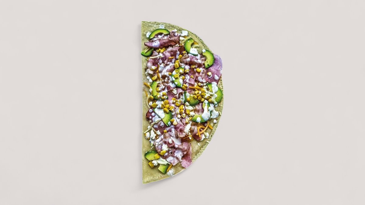 palacinka, cheddar, feta, opečená slanina, kukurica, avokádo, dressing jogurtovo-cesnakový / obsahuje: 1,3,7