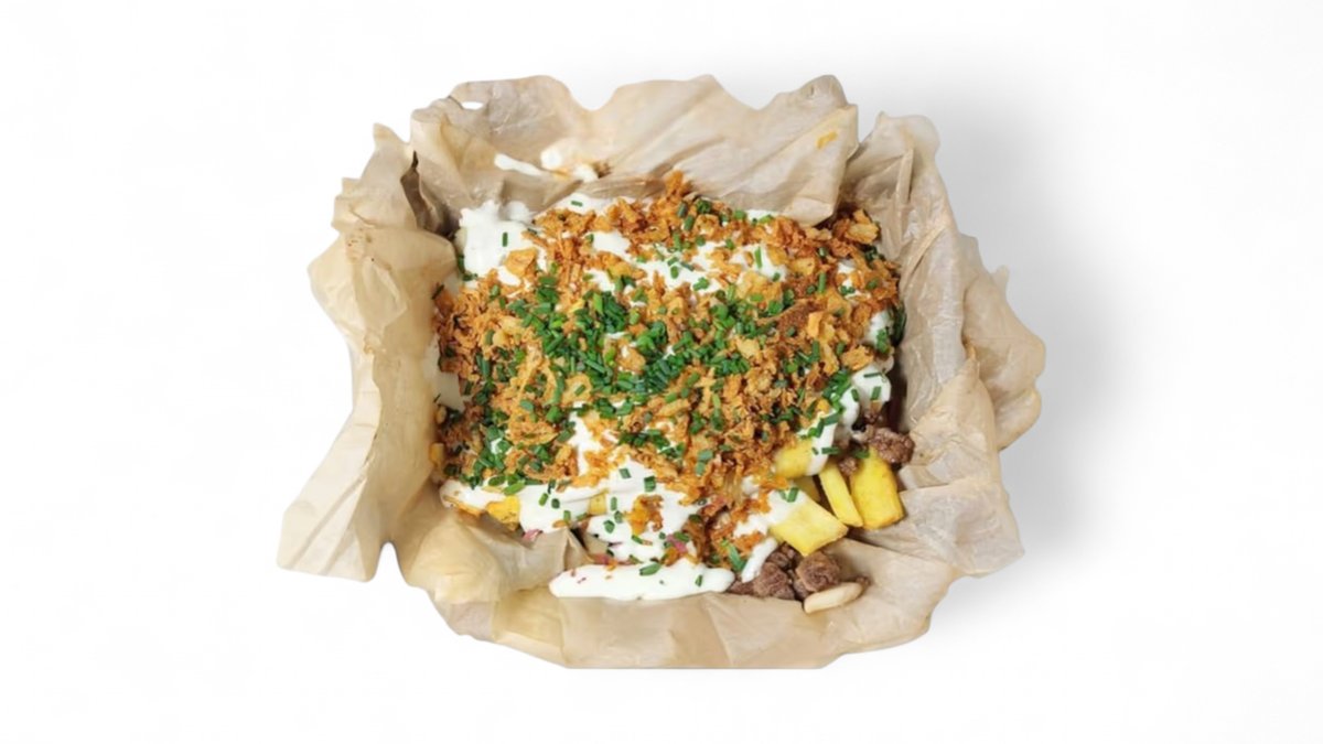 Grilovaná slanina, Gouda, burger omáčka, omáča z pečeného cesnaku, chrumkavá cibuľka, pažítka - naložené na chrumkavých hranolkách (150g)