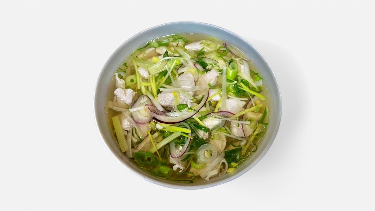 Malý vietnamský vývar s kuracím mäsom, ryžovými rezancami, klíčkami, koriandrom a jarnou cibuľkou.