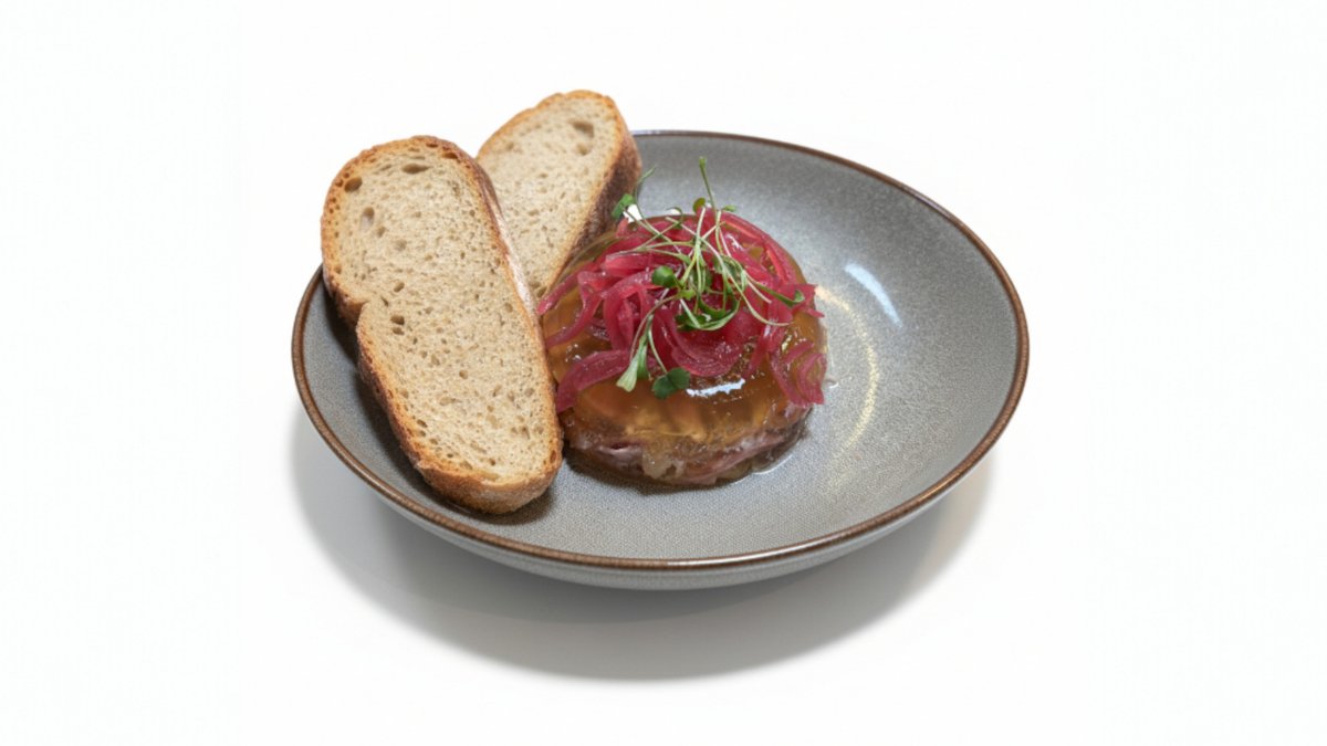 Poctivá domáca huspenina s lokálnym bravčovým mäsom, podávaná s nakladanou červenou cibuľkou, octom a domácim kváskovým chlebíkom (obsahuje: 1)