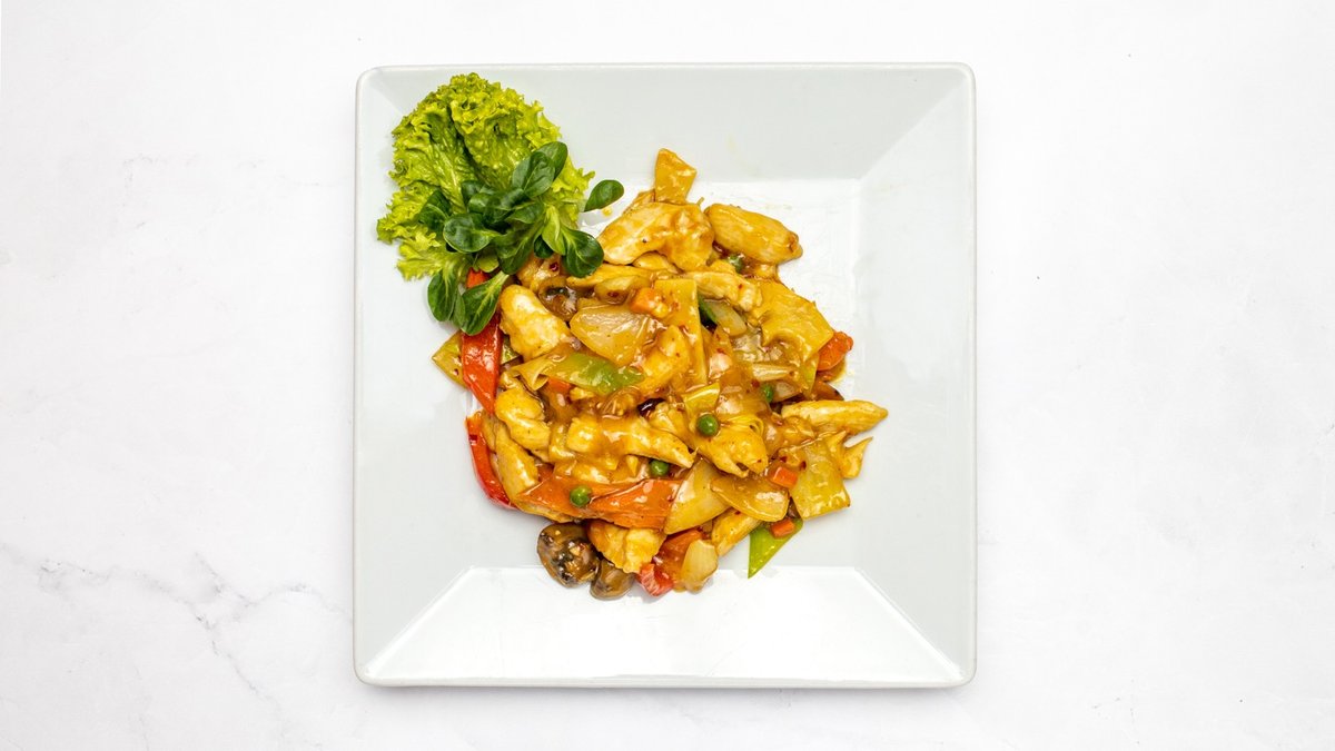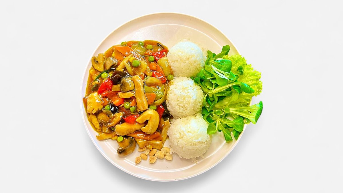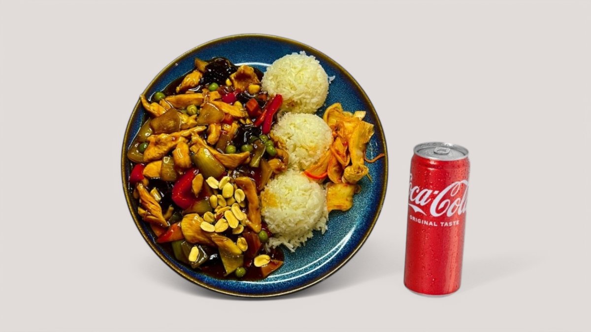 kuracie mäso( 120g) na šťave, zelenina, azijské a shitake huby, bambus, azijské omáčky, arašidy, príloha na výber + nápoj