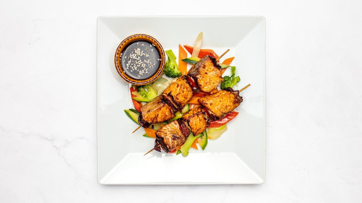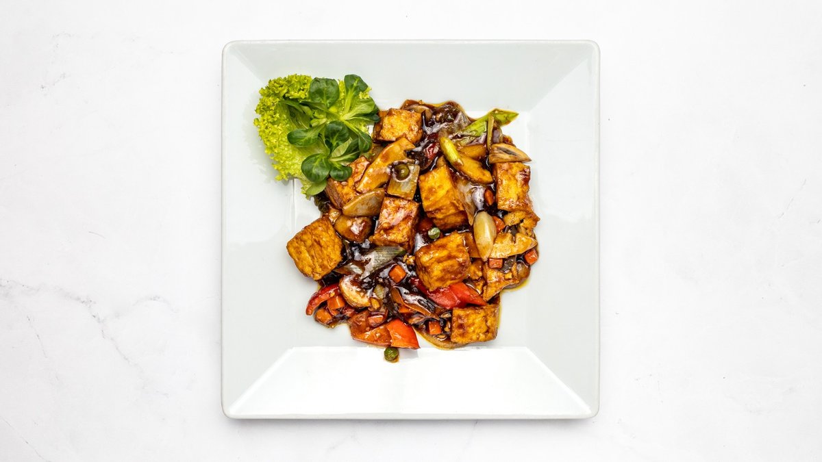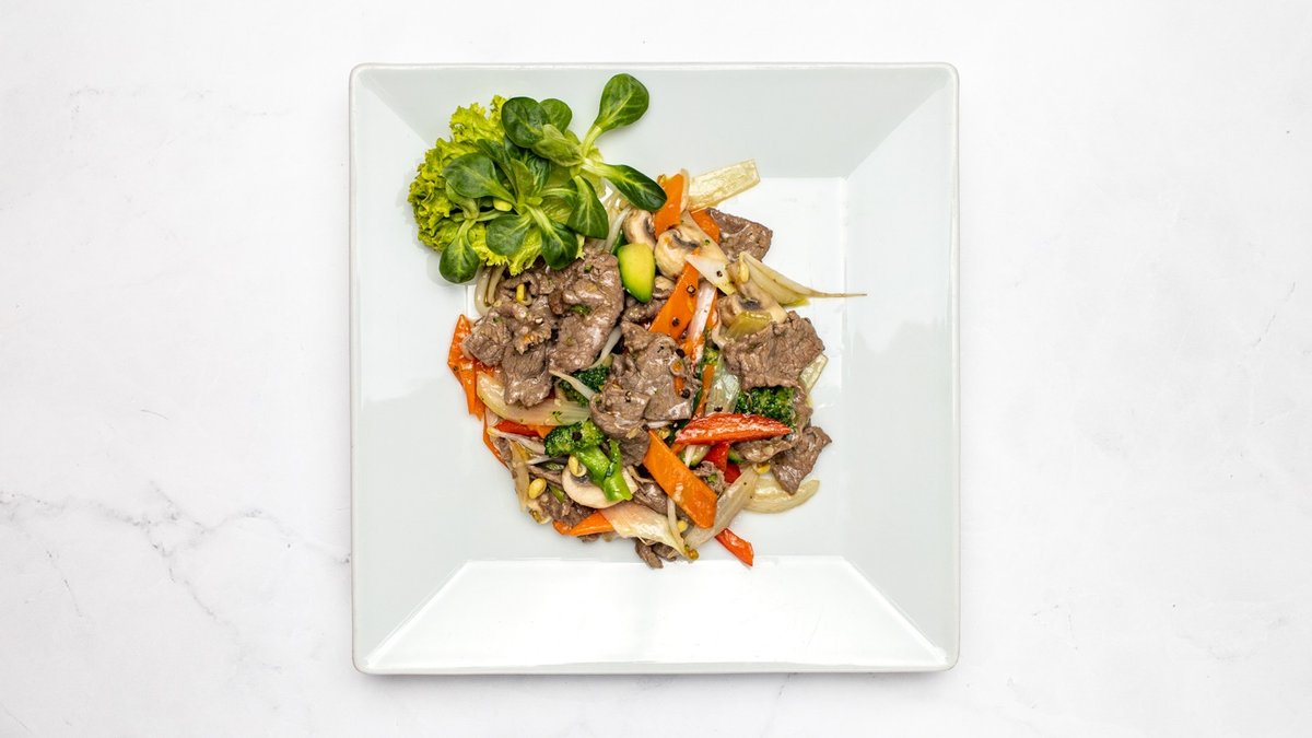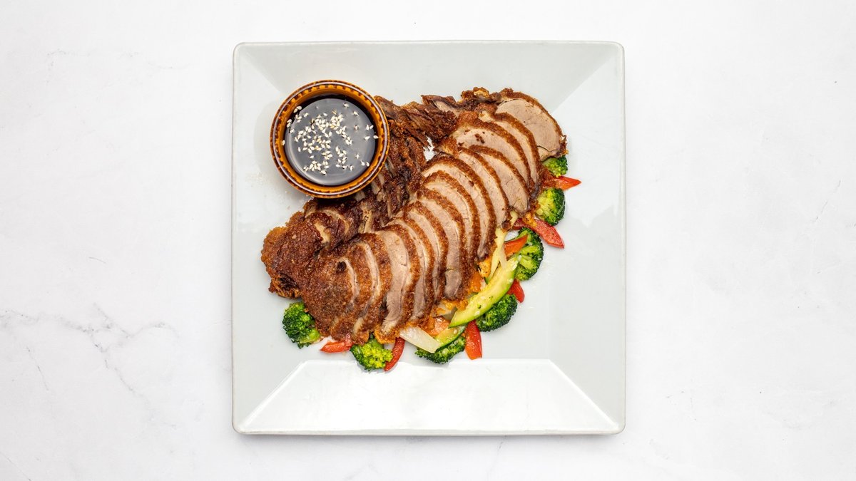 Marinované kačacie plátky (120g) s restovanou zeleninou a teriyaki omáčkou 200g, príloha na výber + nápoj