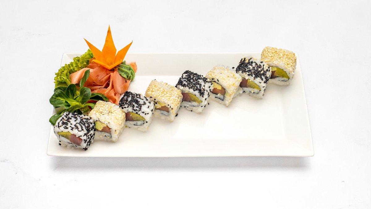 Sushi rolka s tuniakom, lososom, avokádom a reďkovkou, obalená sezamom 8 ks / obsahuje: 4,11