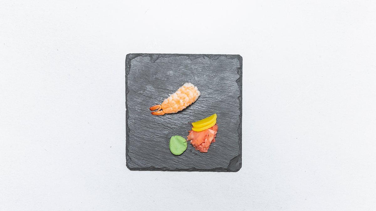 ručne vytvarovaný valček ryže, na ktorom je položený plátok krevety 2ks / 80g / obsahuje: 2