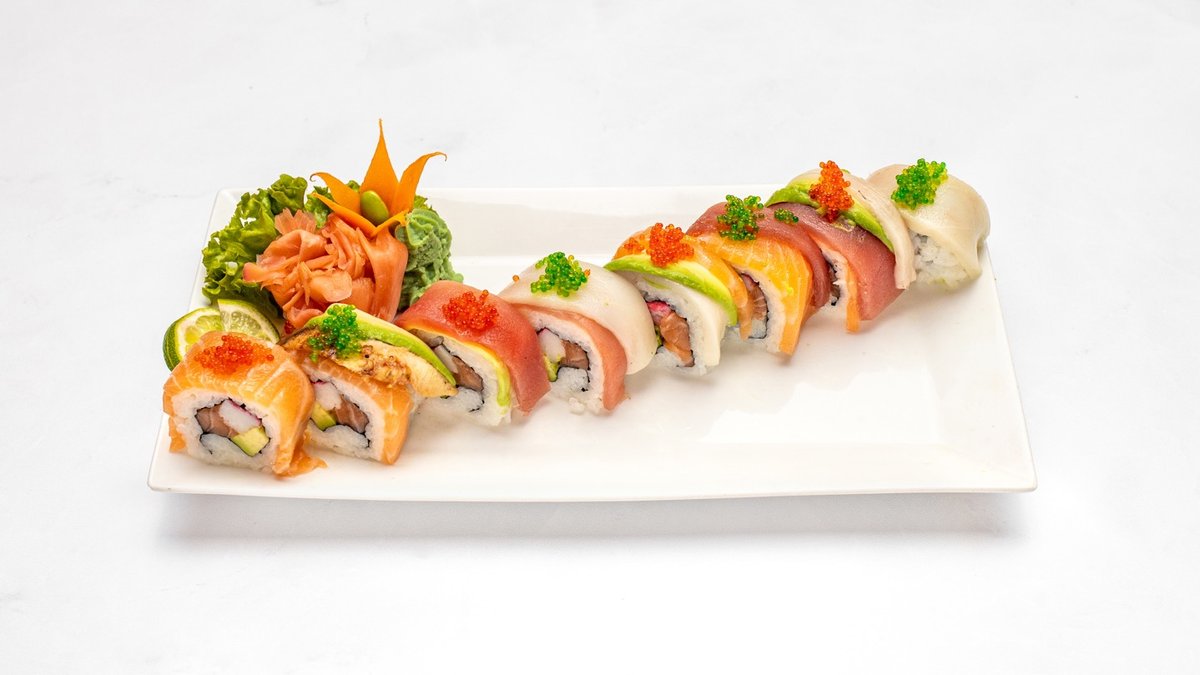 Rolka s farebným kaviárom, avokádom, philadelphiou, jarnou cibuľkou a flambovaným lososom, poliata japonskou majonézou 8 ks / obsahuje: 3,4,6,7,10,11