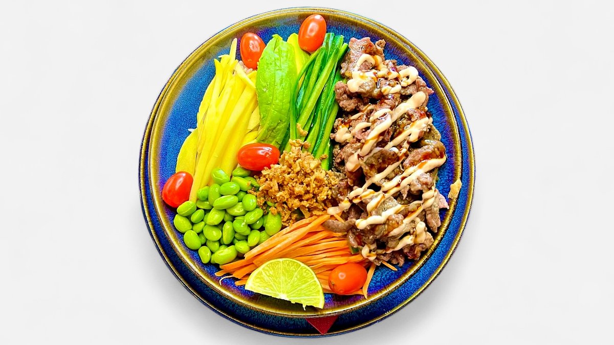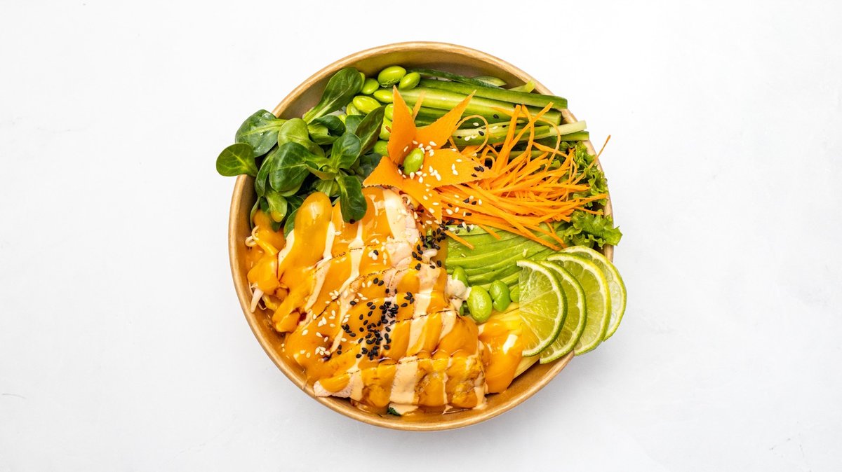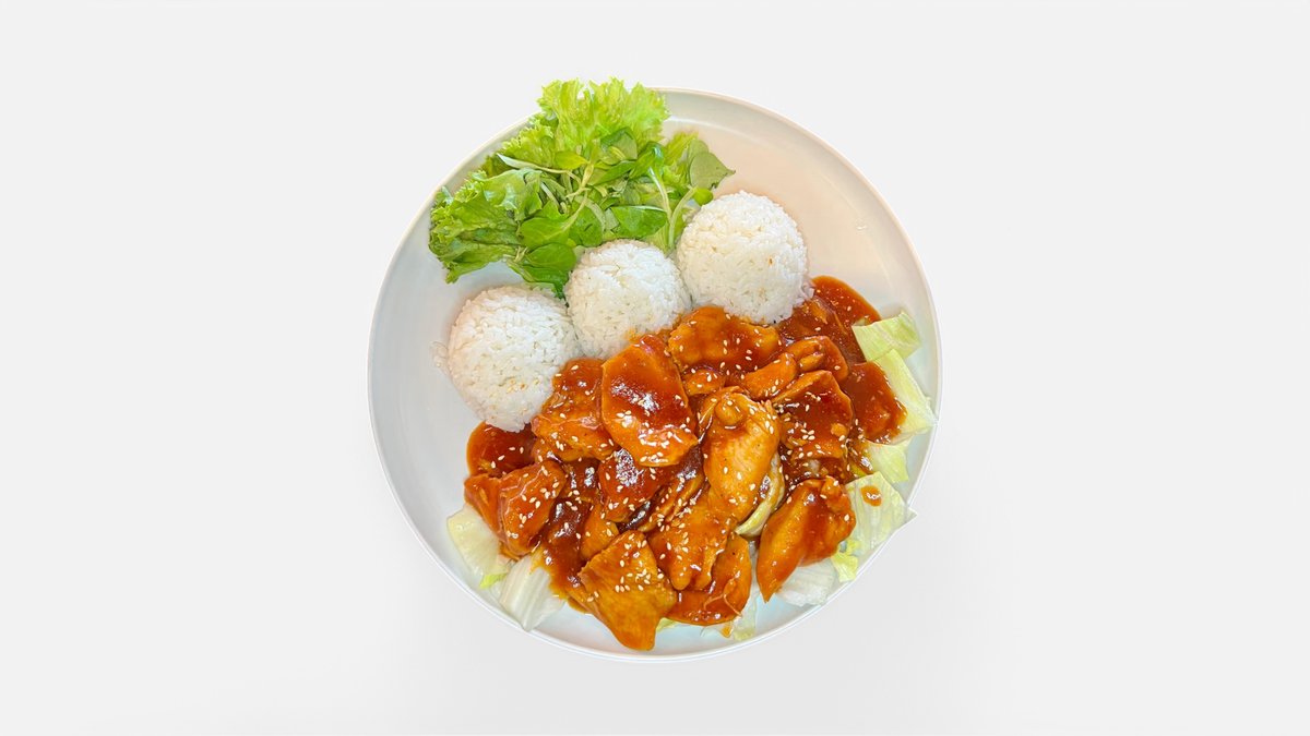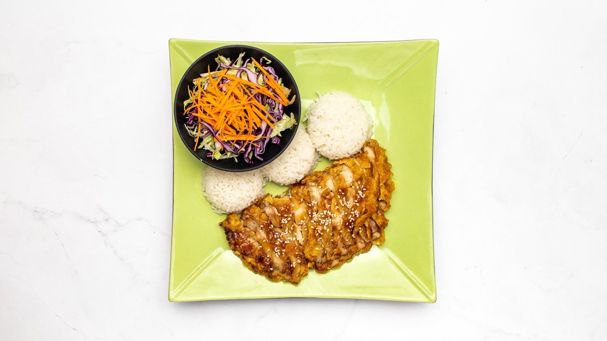 Kuracie stehno (100g) nakrájané na plátky, pripravené na chrumkavý spôsob, grilovaná zelenina, teriyaki omáčka, sezam. Príloha: ryža /250g/