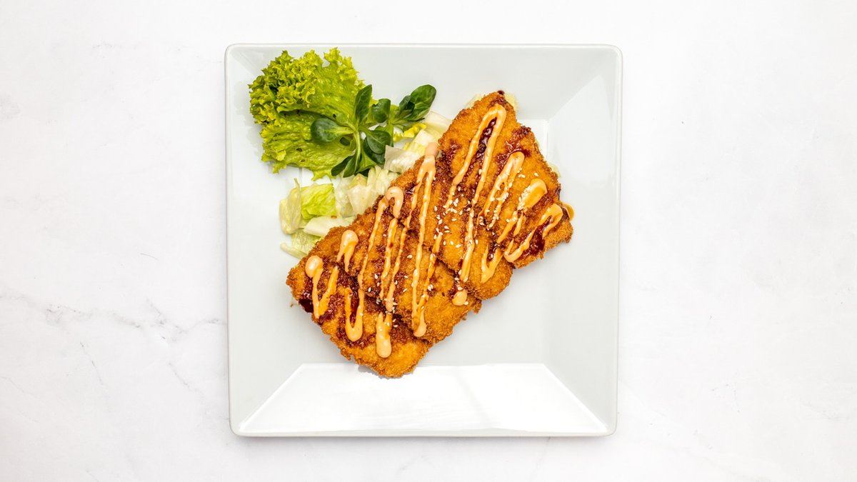 kuracie prsia (120g) v tempure, dochutené sakura omáčkou, majonézou a sezamom 150g / obsahuje: 1,3,6,10,11