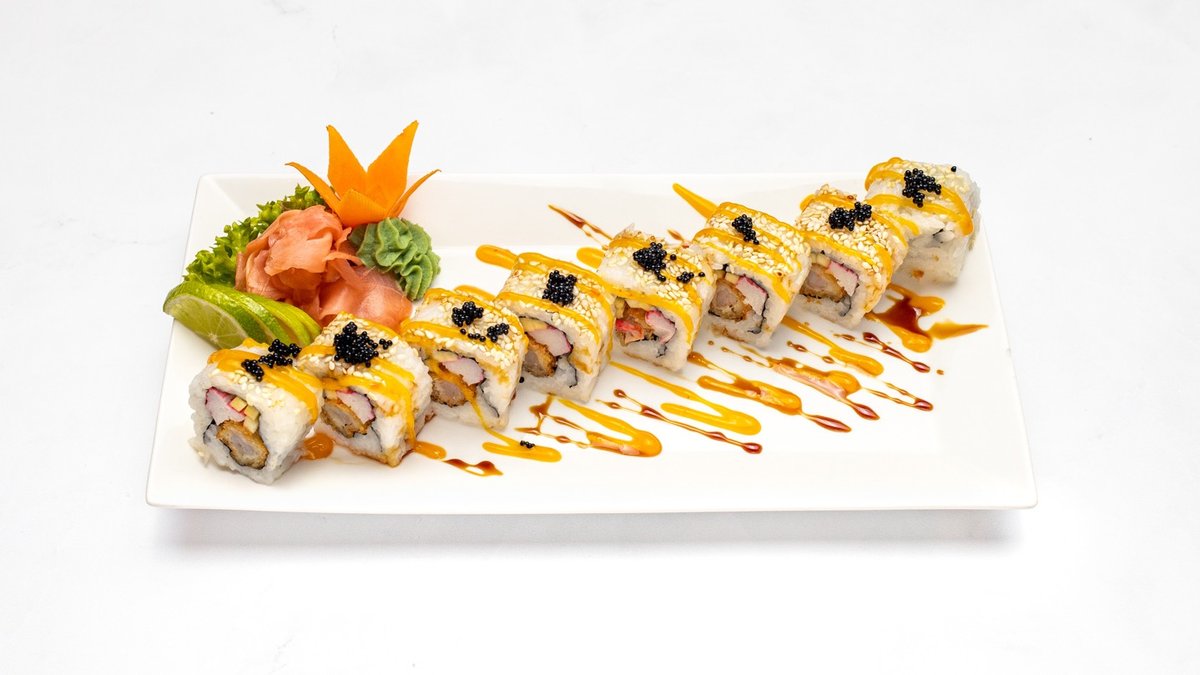 Tempurovaná rolka s lososom, údeným úhorom, philadelphiou, avokádom, sakura omáčkou, japonskou majonézou, sezamom a kaviárom 12ks / obsahuje: 1,3,4,6,7,10,11