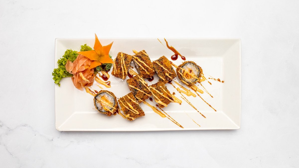 klasické maki v tvare rolky, obalené chrumkavou panko múkou, pripravené na crunchy spôsob, vhodné hlavné pre tých, čo obľubujú tepelne upravené sushi, poliate sakura omáčkou a majonézou 8ks / 100g / obsahuje: 1,2,4,6,10,11