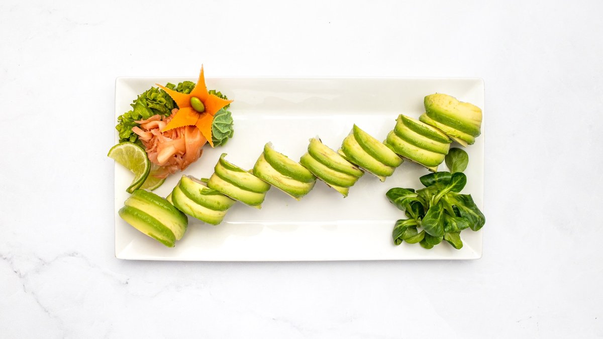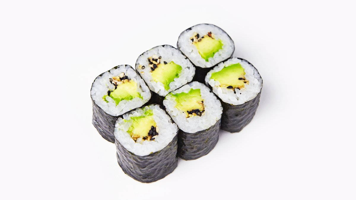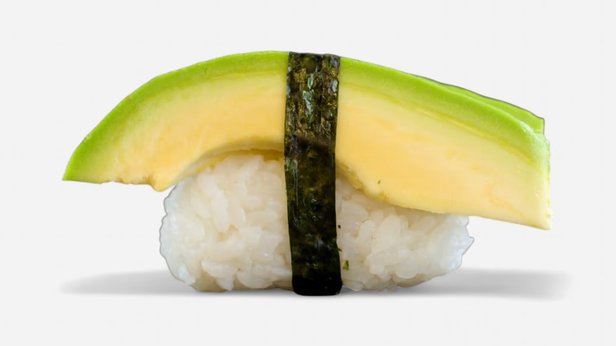 ručne vytvarovaný valček ryže, na ktorom je položený plátok avokáda 2ks / 80g / obsahuje: 11