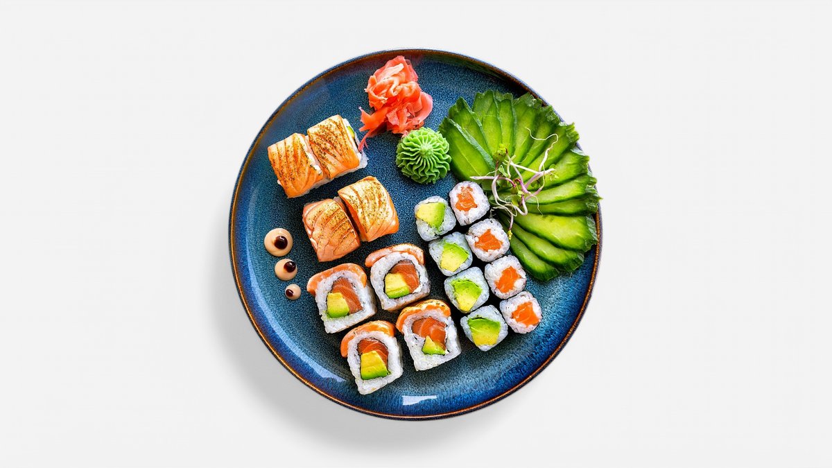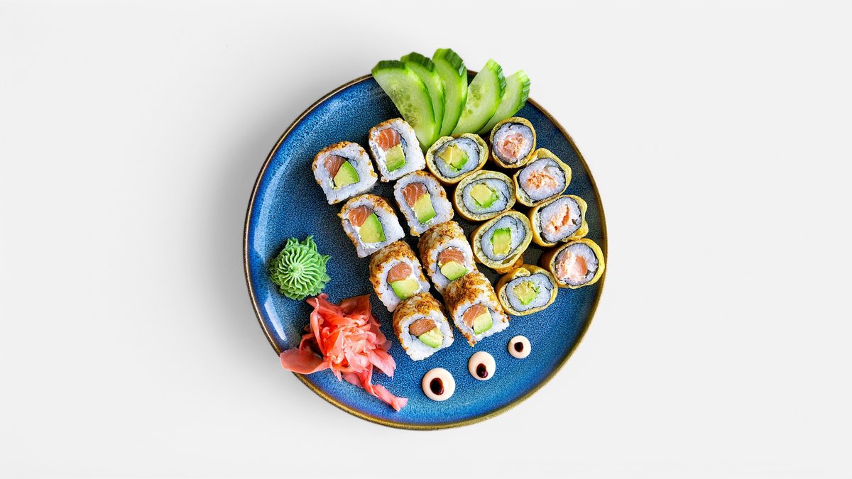 170g losos, ryža, zelenina, 6ks futomaki, california, 3ks maki tuniak, 3ks maki losos, 4ks sashimi