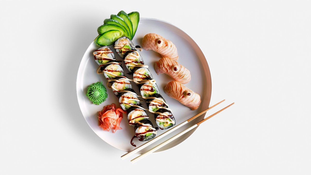 ručne vytvarovaný valček ryže, na ktorom je položený plátok údeného úhora 2ks / 80g / obsahuje: 4, 11